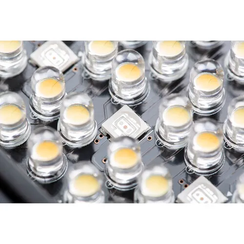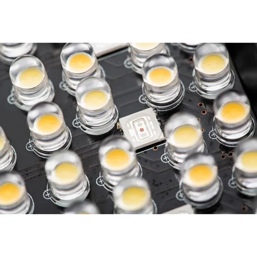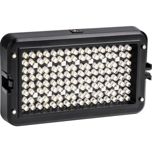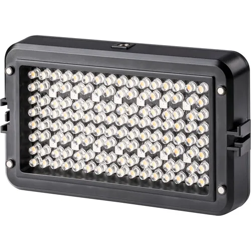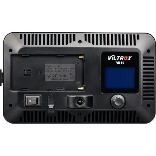 O Iluminador de LED RGB Ajustável RB10 da Viltrox é uma luz LED para câmera com 64 LEDs brancos, 64 LEDs brancos quentes e 14 LEDs RGB. Esta luz compacta de 850 lúmens apresenta uma faixa de temperatura de cor de 3300 a 5600 K e dimerização de 20 a 100%. Uma tela OLED integrada exibe a temperatura de cor, o nível de brilho e a carga restante da bateria.