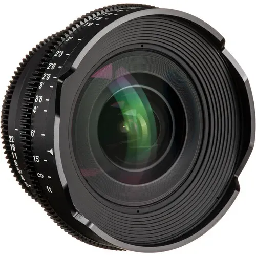 Esta lente de 14mm tem um círculo de imagem que cobre um sensor full-frame. Quando montada em uma câmera com um sensor full-frame, ela fornece um ângulo de visão muito amplo. A lente possui construção metálica para suportar os rigores da produção diária e vem com um pé de suporte que pode ajudar a aliviar a tensão da porta da lente da sua câmera. Foco lateral direito e esquerdo duplo e escalas t-stop permitem que seu extrator de foco funcione de qualquer lado da lente, sem ter que virar a lente na montagem ou virar os numerais para cima.