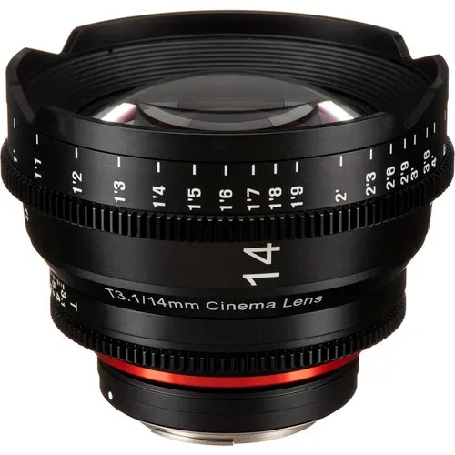 A lente Xeen 14mm T3.1 da Samyang é construída especificamente para uso como uma lente de cinema. Ela apresenta um design de foco interno para que a lente não mude de tamanho durante o foco, minimizando a aparência de respiração ao mudar o foco. Cada lente no conjunto é multirrevestida para bom contraste, prevenção de reflexos e correspondência de cores com um padrão de fábrica, permitindo que você monte um conjunto ao longo do tempo com mudança mínima de cor. Esta lente de 14mm fornece o que é considerado um ângulo de visão muito amplo em câmeras full-frame e um ângulo de visão mais estreito em formatos menores.