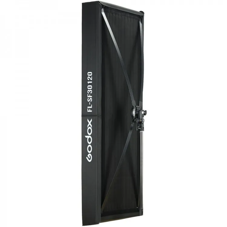 Este Softbox Godox com grade para painel de LED flexível se encaixa no painel retangular de LED flexível FL150R fixando-se diretamente ao suporte de montagem em X incluído no painel.