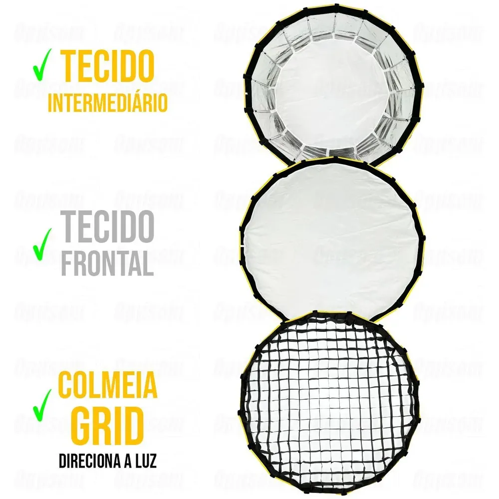 O grande diferencial desse softbox parabólico é sua montagem simples com varetas já embutidas bastando apenas travá-las com um simples clique.