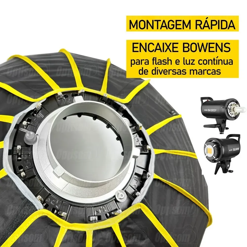 O grande diferencial desse softbox parabólico é sua montagem simples com varetas já embutidas bastando apenas travá-las com um simples clique.