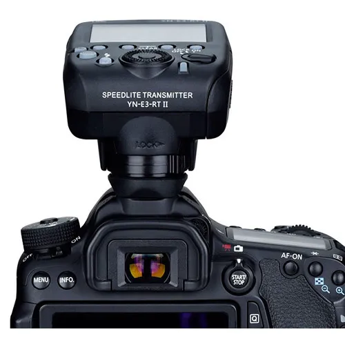 O Transmissor Speedlite Sem Fio Yongnuo YN-E3-RT II para Canon é um dispositivo de disparo sem fio de 16 canais e 5 grupos com um alcance de 100 metros. O transmissor oferece flash automático E-TTL II/E-TTL, flash manual, flash estroboscópico, modos de medição automática de flash externo, bem como controle de taxa de flash 1:8.