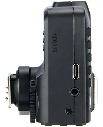 - Uma porta USB Tipo C está localizada na lateral do gatilho sem fio para baixar atualizações de firmware, assim como um soquete de sincronização de 3,5 mm para conectar flashes não TTL ou disparar câmeras por meio de um cabo remoto da câmera.