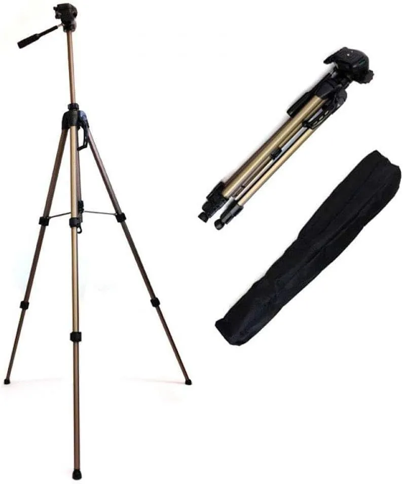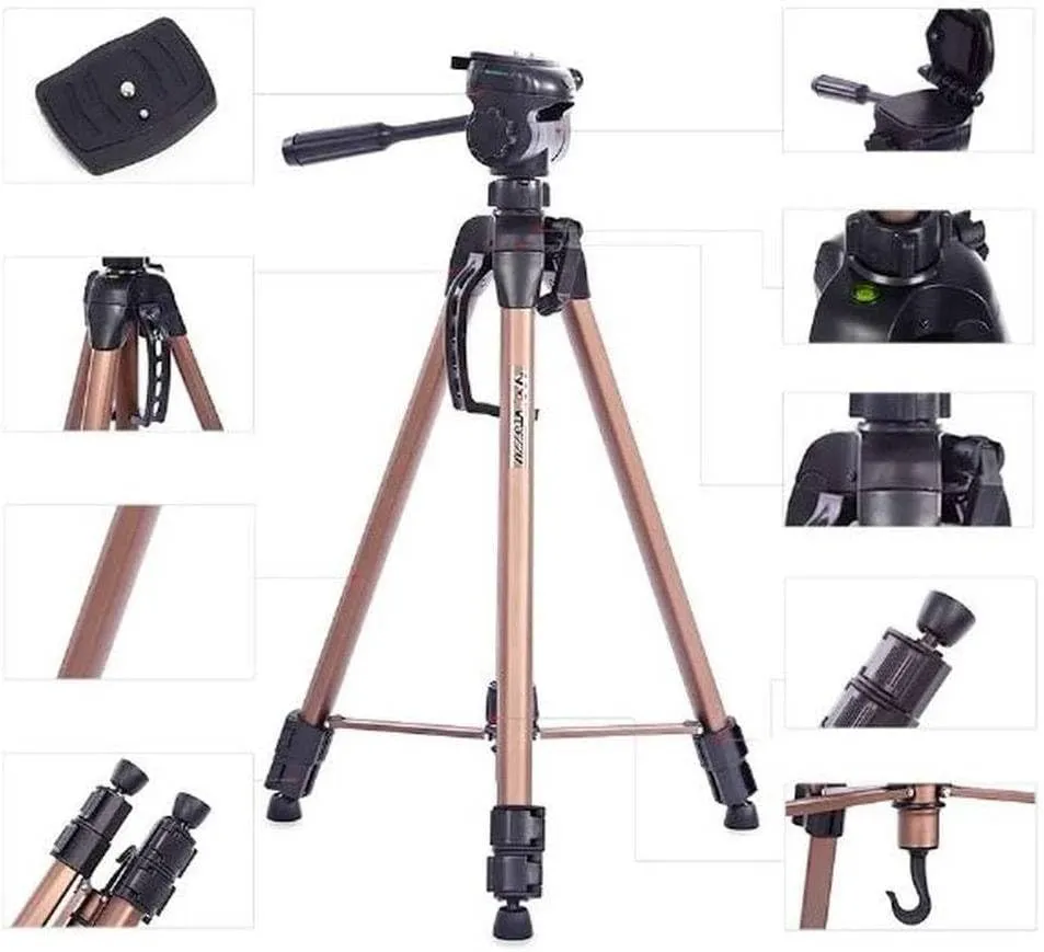 Tripé possui um suporte de mão para dar firmeza e também para manusear o tripé de um local a outro possui um gancho para suportar bolsa ou acessórios, um engate e bolha de nível embutida